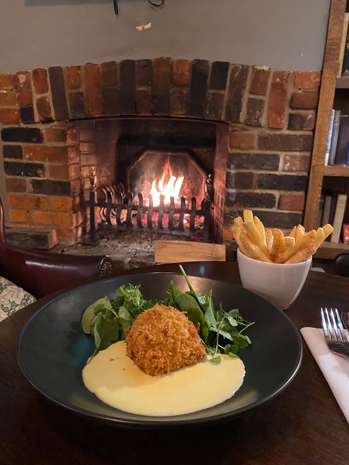 Sit by our fire… have a lovely Pork & Fennel Ravioli or a Crab Cake and Hollandaise Sauce by our lovely warm fire! #autumnwintermenu #thesquirrelpubpennstreet #heartyfooddonewell